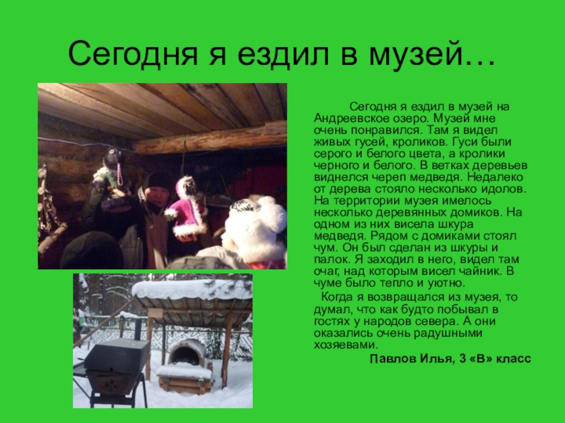 озеро. Музей мне очень понравился. Там я видел живых гусей, кроликов. Гуси были серого и белого цвета, а кролики черного и белого. В ветках деревьев виднелся череп медведя. Недалеко от дерева стояло несколько идолов. На территории музея имелось несколько деревянных домиков. На одном из них висела шкура медведя. Рядом с домиками стоял чум. Он был сделан из шкуры и палок. Я заходил в него, видел там очаг, над которым висел чайник. В чуме было тепло и уютно.