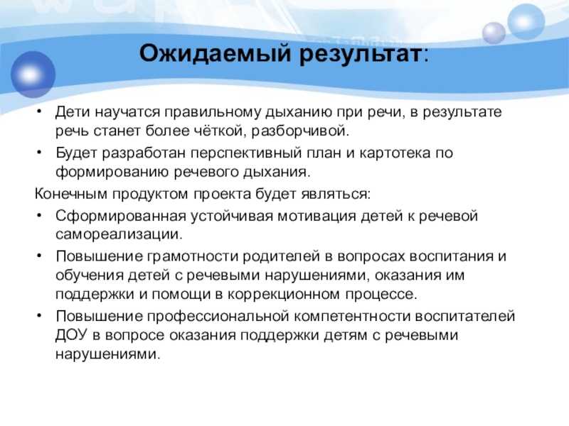 Будет разработан перспективный план и картотека по формированию речевого дыхания.