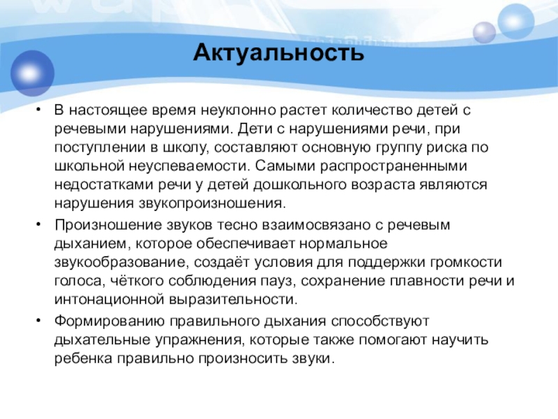 Проблема: Несформированность речевого выдоха и отсутствие навыка испускания