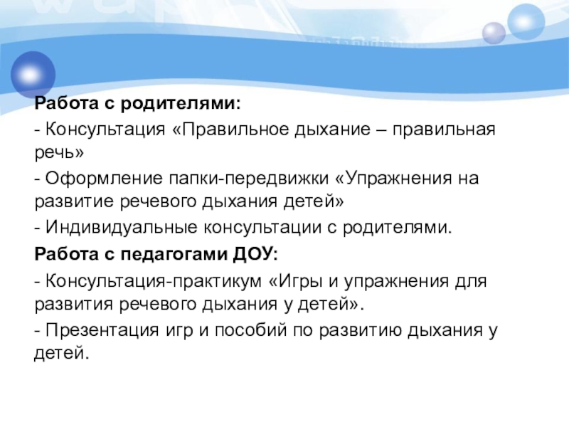 - Планирование работы с родителями по вопросу формирования правильного дыхания