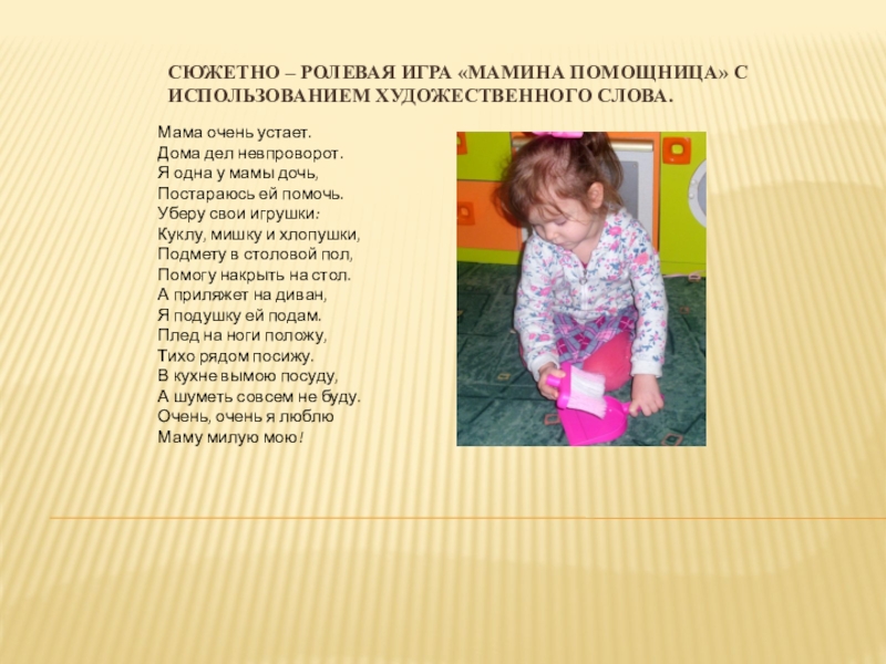 Слайд 22Сюжетно – ролевая игра «Мамина помощница» с использованием художественного слова.