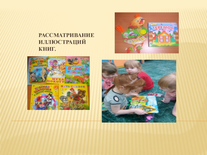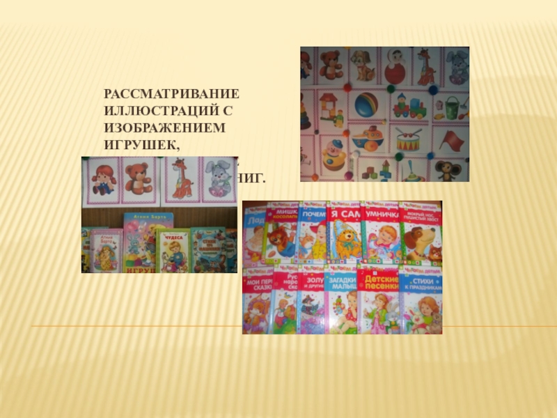 Рассматривание иллюстраций с изображением игрушек, рассматривание иллюстраций книг.