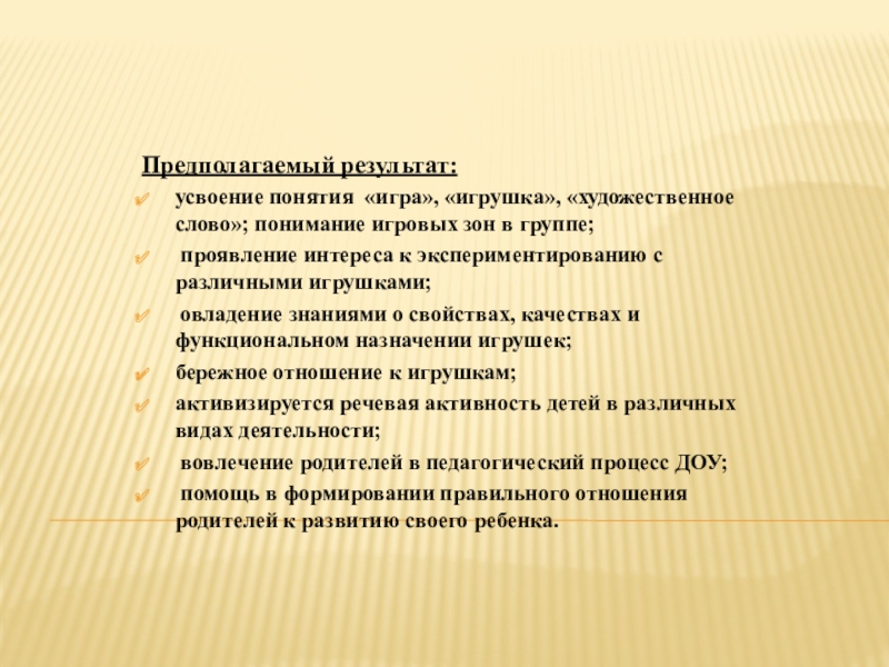 усвоение понятия «игра», «игрушка», «художественное слово»; понимание игровых зон