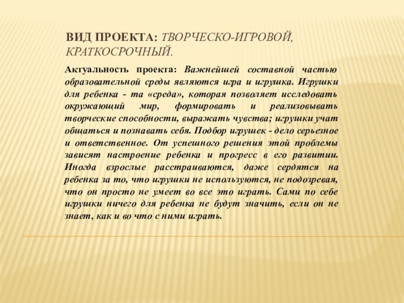 игра и игрушка. Игрушки для ребенка - та «среда», которая позволяет исследовать окружающий мир, формировать и реализовывать творческие способности, выражать чувства; игрушки учат общаться и познавать себя. Подбор игрушек - дело серьезное и ответственное. От успешного решения этой проблемы зависят настроение ребенка и прогресс в его развитии. Иногда взрослые расстраиваются, даже сердятся на ребенка за то, что игрушки не используются, не подозревая, что он просто не умеет во все это играть. Сами по себе игрушки ничего для ребенка не будут значить, если он не знает, как и во что с ними играть.