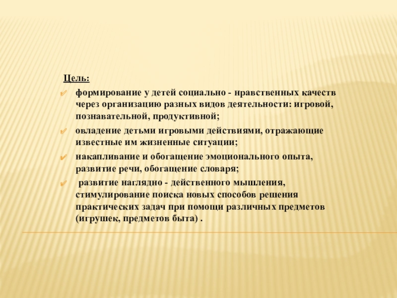 развитие наглядно - действенного мышления, стимулирование поиска новых способов решения практических задач при помощи различных предметов (игрушек, предметов быта) .