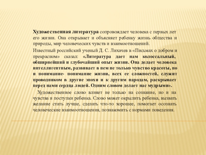 Известный российский ученый Д. С. Лихачев в «Письмах о добром и прекрасном» сказал: «Литература дает нам колоссальный, обширнейший и глубочайший опыт жизни. Она делает человека интеллигентным, развивает в нем не только чувство красоты, но и понимание- понимание жизни, всех ее сложностей, служит проводником в другие эпохи и к другим народам, раскрывает перед нами сердца людей. Одним словом делает нас мудрыми».