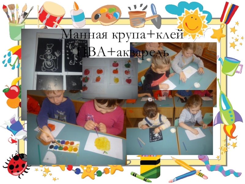 4. На занятиях по рисованию познакомить детей с техникой раздувания краски, рисования ватными палочками, рисования листьями, рисование манкой, рисование поролоном, рисование пластилином, рисование витражными красками.