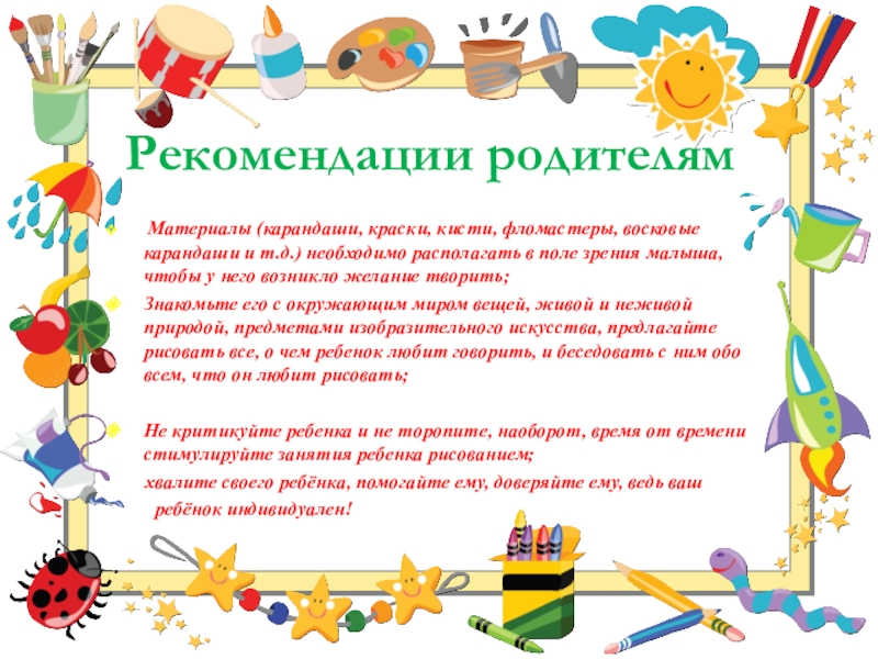 Не критикуйте ребенка и не торопите, наоборот, время от времени стимулируйте занятия ребенка рисованием;