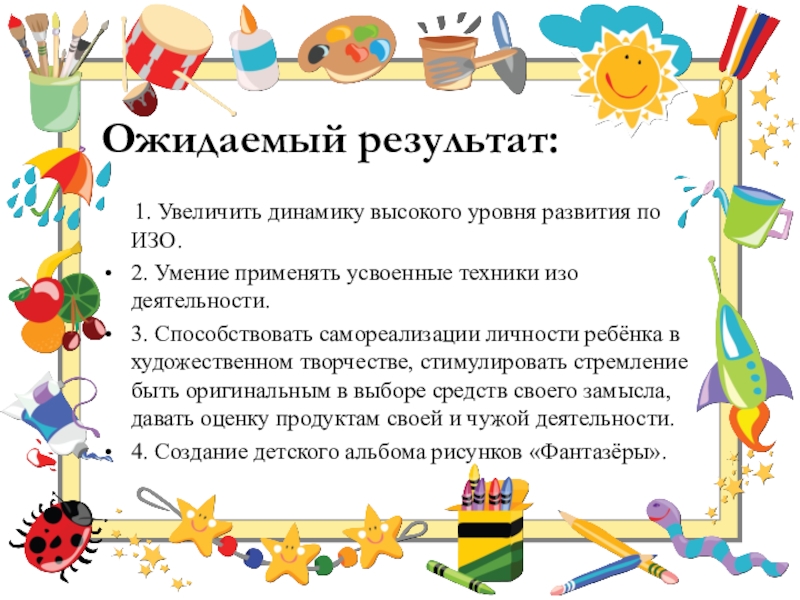 1. Выявить уровень художественно- творческих способностей детей, выработанный в