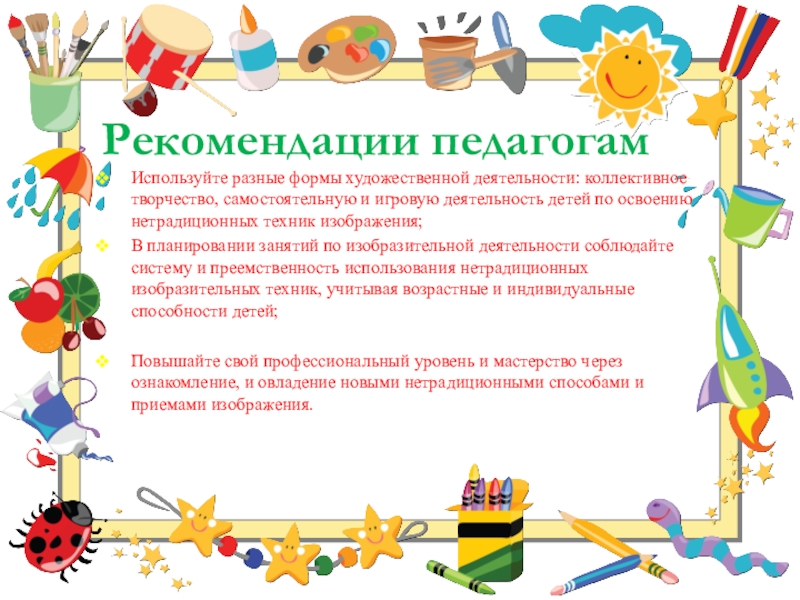 В планировании занятий по изобразительной деятельности соблюдайте систему и преемственность использования нетрадиционных изобразительных техник, учитывая возрастные и индивидуальные способности детей;