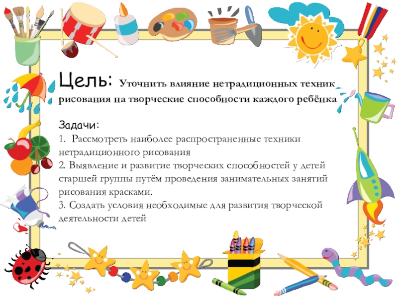 Слайд 7Цель: Уточнить влияние нетрадиционных техник рисования на творческие способности каждого ребёнка