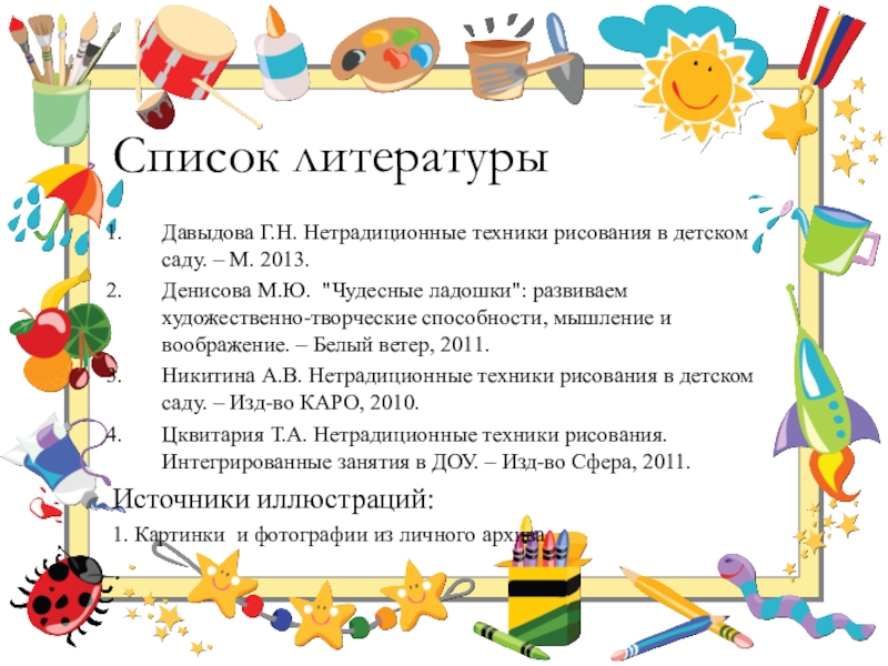 Никитина А.В. Нетрадиционные техники рисования в детском саду. – Изд-во КАРО, 2010.