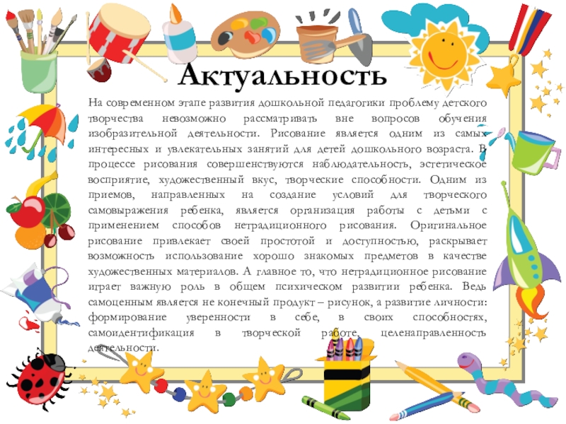 рассматривать вне вопросов обучения изобразительной деятельности. Рисование является одним из самых интересных и увлекательных занятий для детей дошкольного возраста. В процессе рисования совершенствуются наблюдательность, эстетическое восприятие, художественный вкус, творческие способности. Одним из приемов, направленных на создание условий для творческого самовыражения ребенка, является организация работы с детьми с применением способов нетрадиционного рисования. Оригинальное рисование привлекает своей простотой и доступностью, раскрывает возможность использование хорошо знакомых предметов в качестве художественных материалов. А главное то, что нетрадиционное рисование играет важную роль в общем психическом развитии ребенка. Ведь самоценным является не конечный продукт – рисунок, а развитие личности: формирование уверенности в себе, в своих способностях, самоидентификация в творческой работе, целенаправленность деятельности.
