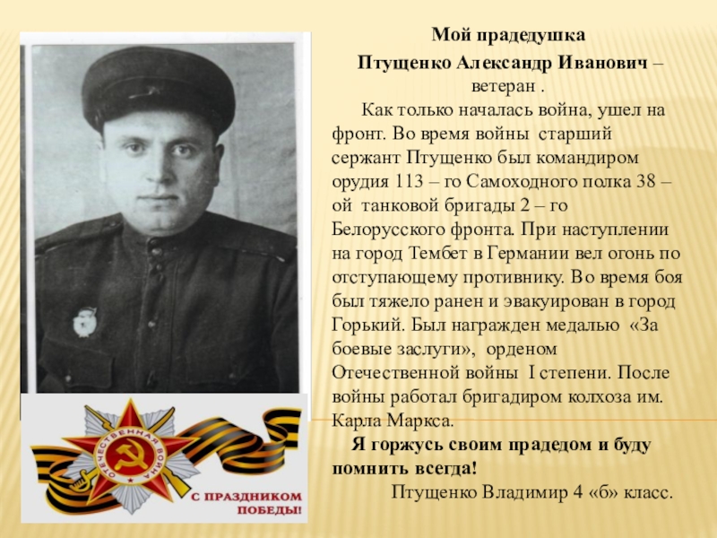 Александров Василий Алексеевич – ветеран Великой Отечественной войны. Прадед ушел на фронт в 1942 году. А вернулся с фронта 1945 году, награжден был медалью «За боевые заслуги». После войны работал в колхозе, затем в совхозе.