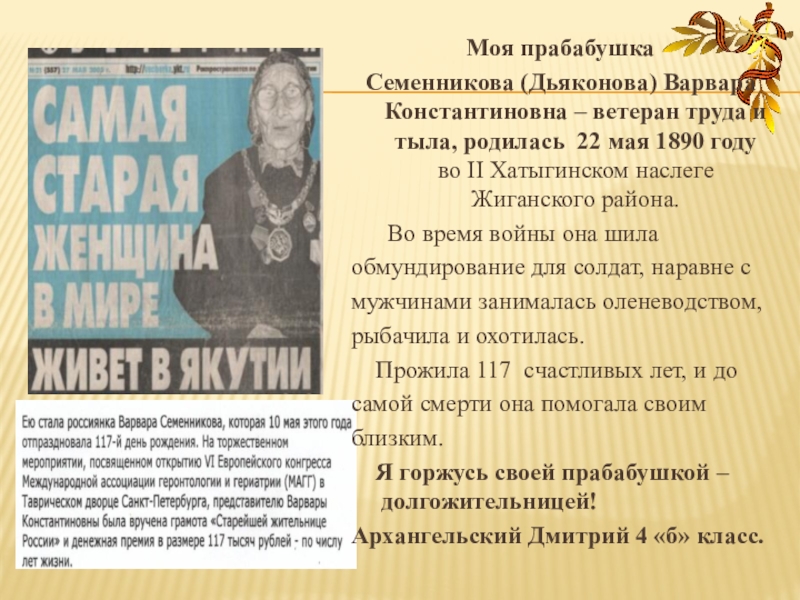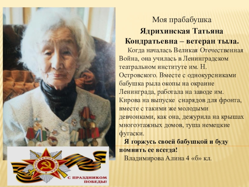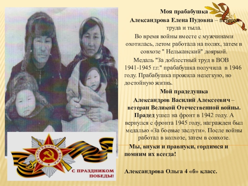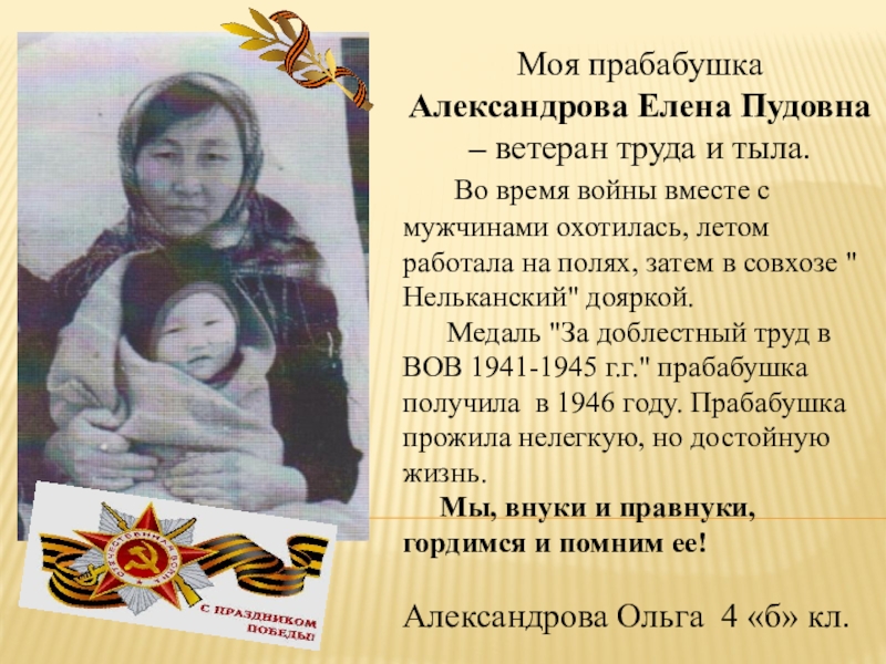 Слайд 2Моя прабабушка Александрова Елена Пудовна – ветеран труда и тыла.