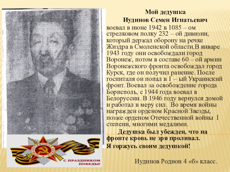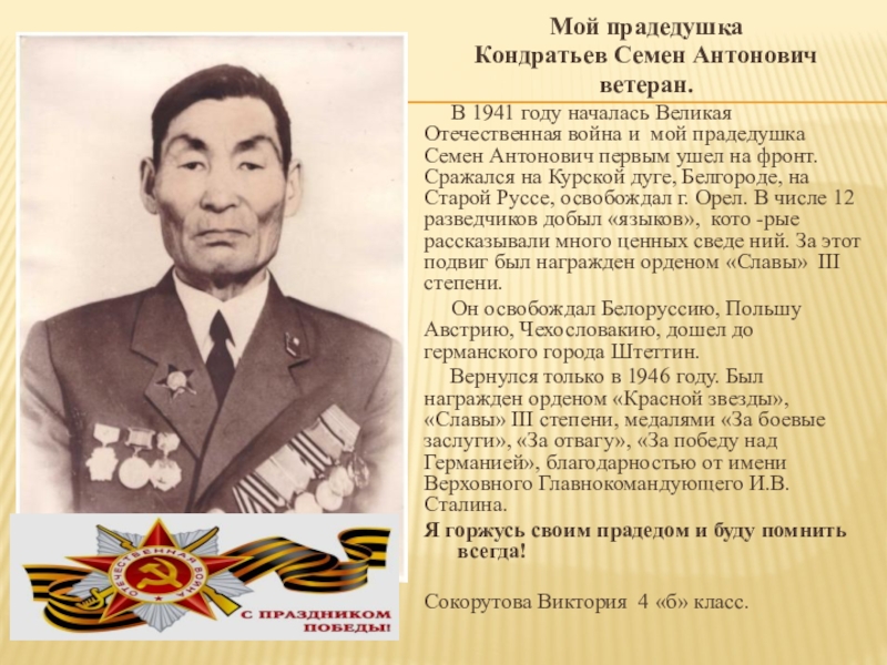 Отечественная война и мой прадедушка Семен Антонович первым ушел на фронт. Сражался на Курской дуге, Белгороде, на Старой Руссе, освобождал г. Орел. В числе 12 разведчиков добыл «языков», кото -рые рассказывали много ценных сведе ний. За этот подвиг был награжден орденом «Славы» III степени.
