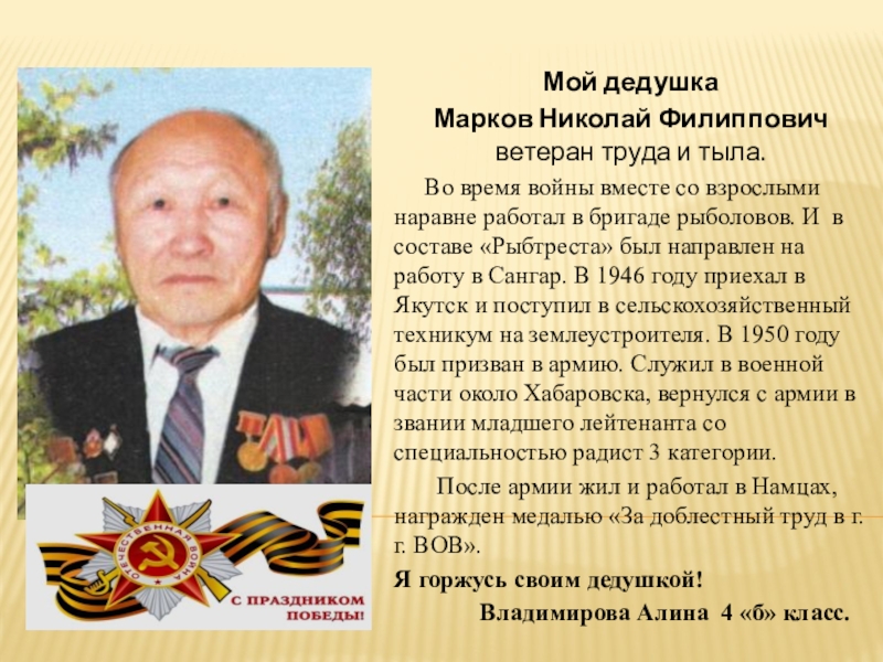 Я горжусь своим дедушкой и буду помнить его всегда! Спасибо дедушке за мирное небо!