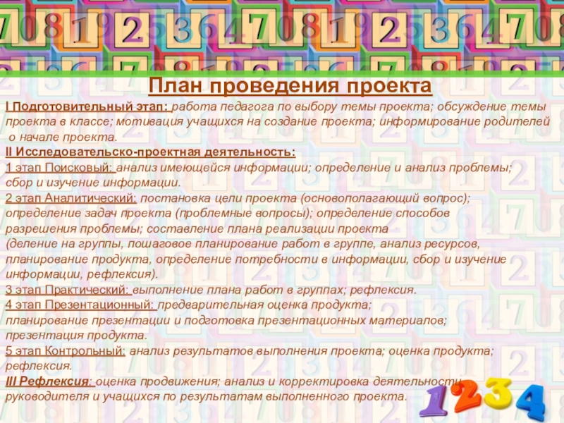План проведения проектаI Подготовительный этап: работа педагога по выбору темы проекта; обсуждение темы проекта в классе; мотивация