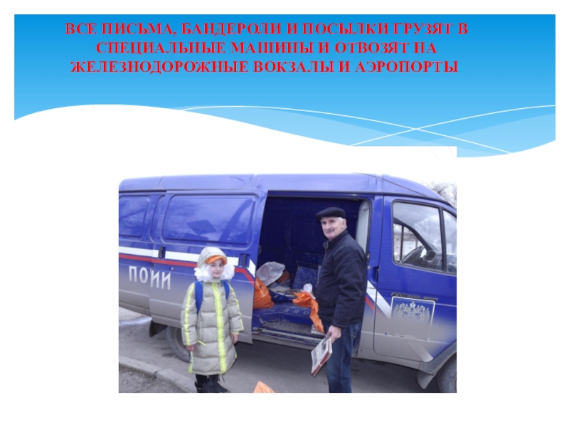 Слайд 11ВСЕ ПИСЬМА, БАНДЕРОЛИ И ПОСЫЛКИ ГРУЗЯТ В СПЕЦИАЛЬНЫЕ МАШИНЫ И ОТВОЗЯТ
