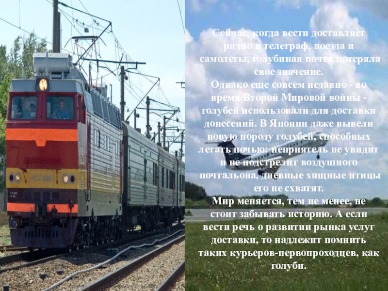 Сейчас, когда вести доставляет радио и телеграф, поезда и самолеты, голубиная