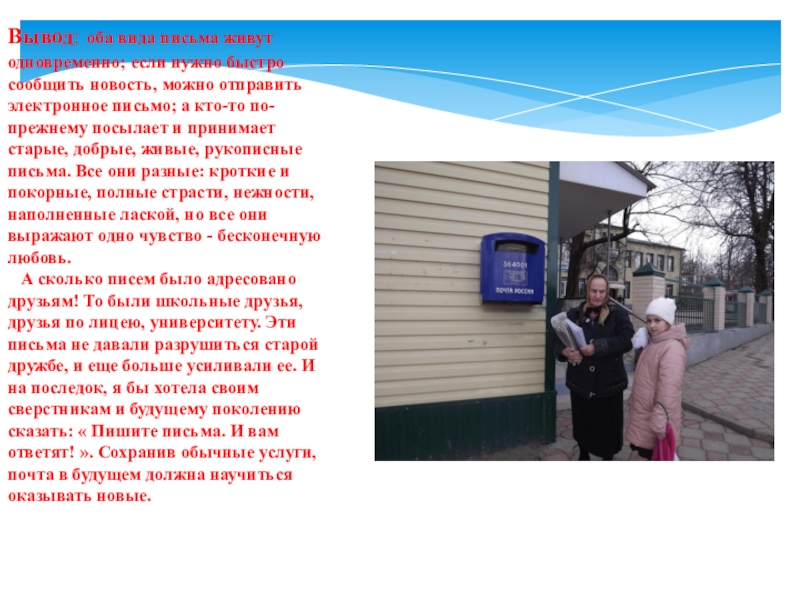 Слайд 14Вывод: оба вида письма живут одновременно; если нужно быстро сообщить новость,