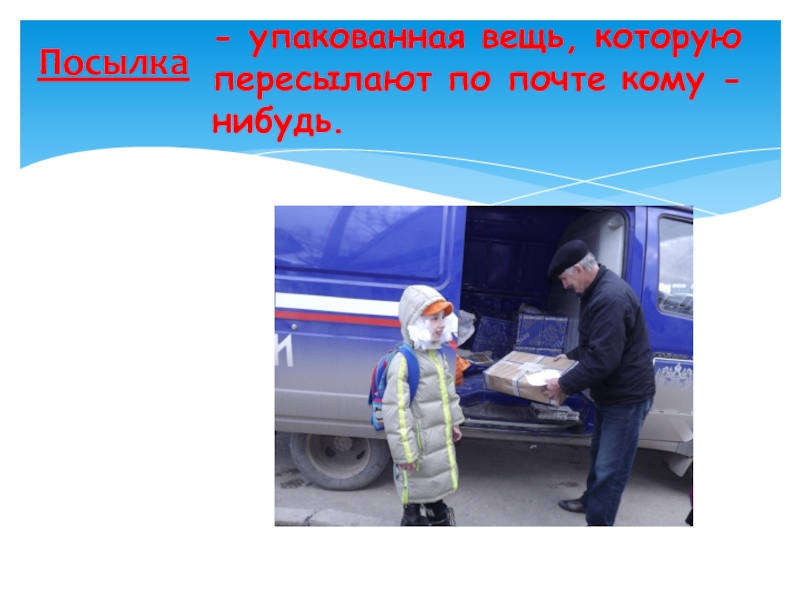 - упакованная вещь, которую пересылают по почте кому -нибудь.