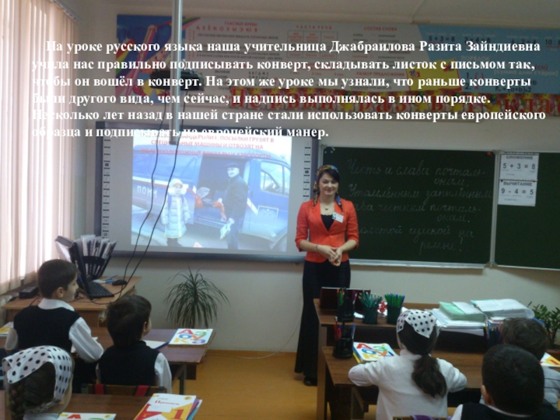 Слайд 5 На уроке русского языка наша учительница Джабраилова Разита Зайндиевна