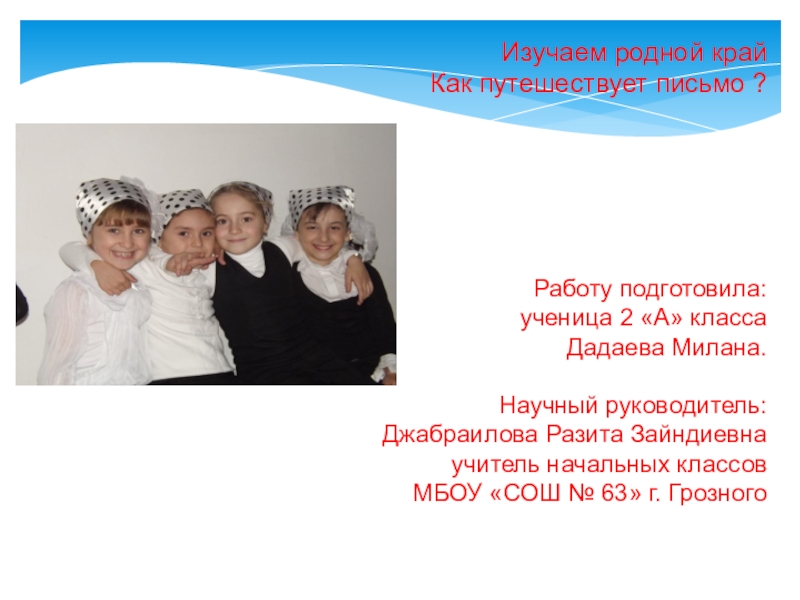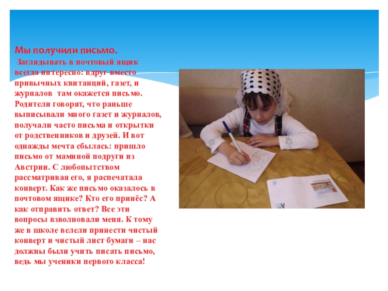 привычных квитанций, газет, и журналов там окажется письмо. Родители говорят, что раньше выписывали много газет и журналов, получали часто письма и открытки от родственников и друзей. И вот однажды мечта сбылась: пришло письмо от маминой подруги из Австрии. С любопытством рассматривая его, я распечатала конверт. Как же письмо оказалось в почтовом ящике? Кто его принёс? А как отправить ответ? Все эти вопросы взволновали меня. К тому же в школе велели принести чистый конверт и чистый лист бумаги – нас должны были учить писать письмо, ведь мы ученики первого класса!