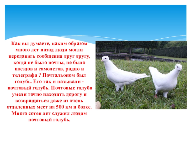 могли передавать сообщения друг другу, когда не было почты, не было поездов и самолетов, радио и телеграфа ? Почтальоном был голубь. Его так и называли - почтовый голубь. Почтовые голуби умели точно находить дорогу и возвращаться даже из очень отдаленных мест на 500 км и более. Много сотен лет служил людям почтовый голубь.