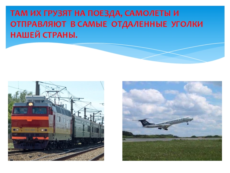 Слайд 12ТАМ ИХ ГРУЗЯТ НА ПОЕЗДА, САМОЛЕТЫ И ОТПРАВЛЯЮТ В САМЫЕ ОТДАЛЕННЫЕ
