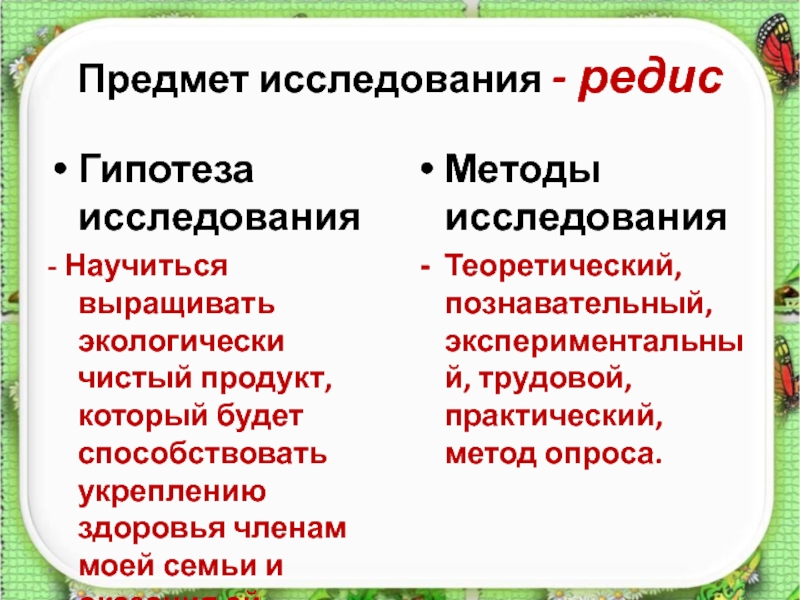 Теоретический, познавательный, экспериментальный, трудовой, практический, метод опроса.