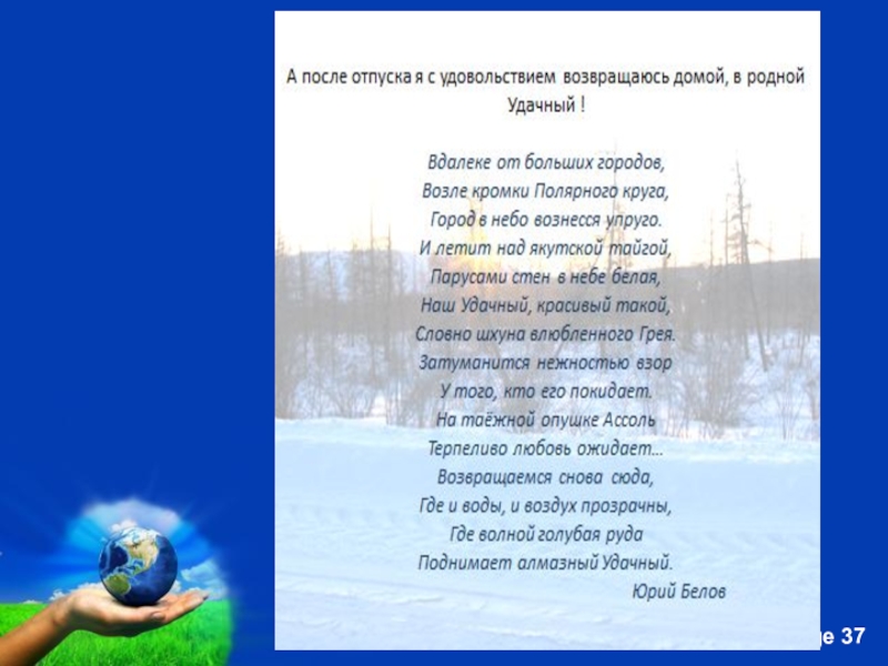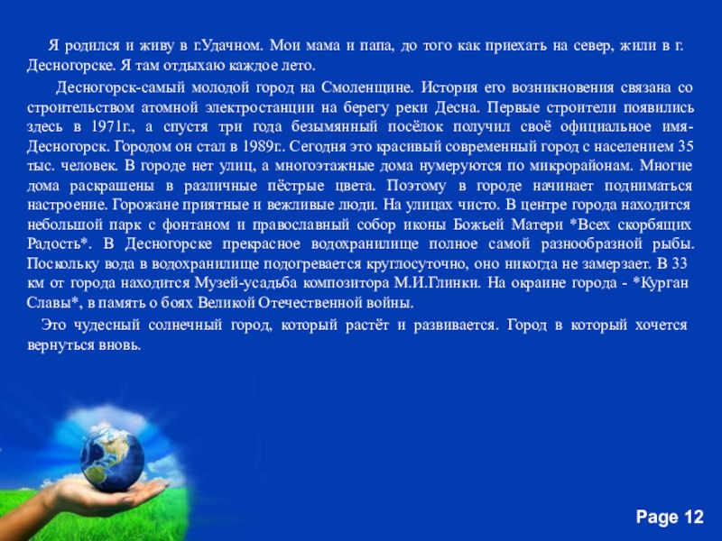 Слайд 12 Я родился и живу в г.Удачном. Мои мама и