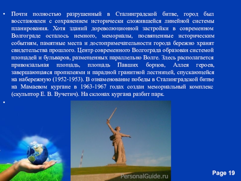 исторически сложившейся линейной системы планирования. Хотя зданий дореволюционной застройки в современном Волгограде осталось немного, мемориалы, посвященные историческим событиям, памятные места и достопримечательности города бережно хранят свидетельства прошлого. Центр современного Волгограда образован системой площадей и бульваров, размещенных параллельно Волге. Здесь располагается привокзальная площадь, площадь Павших борцов, Аллея героев, завершающаяся пропилеями и парадной гранитной лестницей, спускающейся на набережную (1952-1953). В ознаменование победы в Сталинградской битве на Мамаевом кургане в 1963-1967 годах создан мемориальный комплекс (скульптор Е. В. Вучетич). На склонах кургана разбит парк.