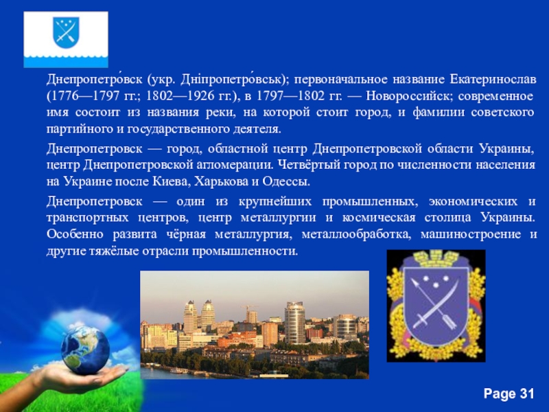 Слайд 31Днепропетро́вск (укр. Дніпропетро́вськ); первоначальное название Екатеринослав (1776—1797 гг.; 1802—1926 гг.), в