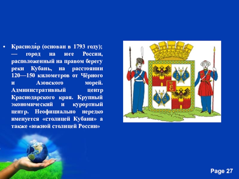 Слайд 27Краснода́р (основан в 1793 году); — город на юге России, расположенный