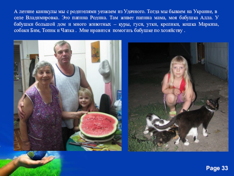 бываем на Украине, в селе Владимировка. Это папина Родина. Там живет папина мама, моя бабушка Алла. У бабушки большой дом и много животных – куры, гуси, утки, кролики, кошка Маркиза, собаки Бим, Топик и Чапка . Мне нравится помогать бабушке по хозяйству .