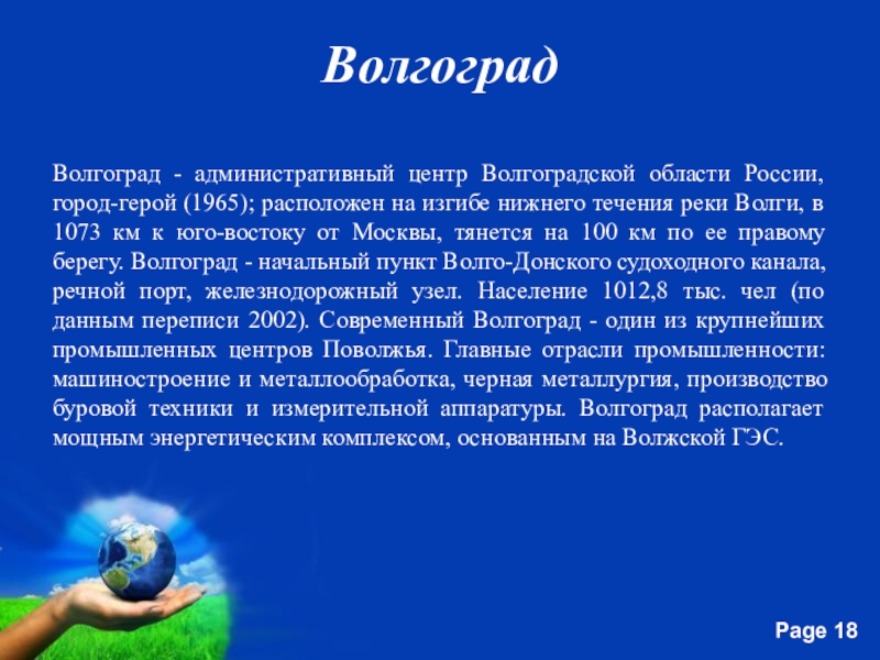 изгибе нижнего течения реки Волги, в 1073 км к юго-востоку от Москвы, тянется на 100 км по ее правому берегу. Волгоград - начальный пункт Волго-Донского судоходного канала, речной порт, железнодорожный узел. Население 1012,8 тыс. чел (по данным переписи 2002). Современный Волгоград - один из крупнейших промышленных центров Поволжья. Главные отрасли промышленности: машиностроение и металлообработка, черная металлургия, производство буровой техники и измерительной аппаратуры. Волгоград располагает мощным энергетическим комплексом, основанным на Волжской ГЭС.
