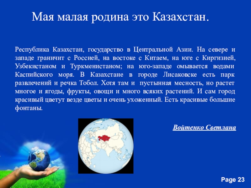 севере и западе граничит с Россией, на востоке с Китаем, на юге с Киргизией, Узбекистаном и Туркменистаном; на юго-западе омывается водами Каспийского моря. В Казахстане в городе Лисаковске есть парк развлечений и речка Тобол. Хотя там и пустынная месность, но растет многое и ягоды, фрукты, овощи и много всяких растений. И сам город красивый цветут везде цветы и очень ухоженный. Есть красивые большие фонтаны.