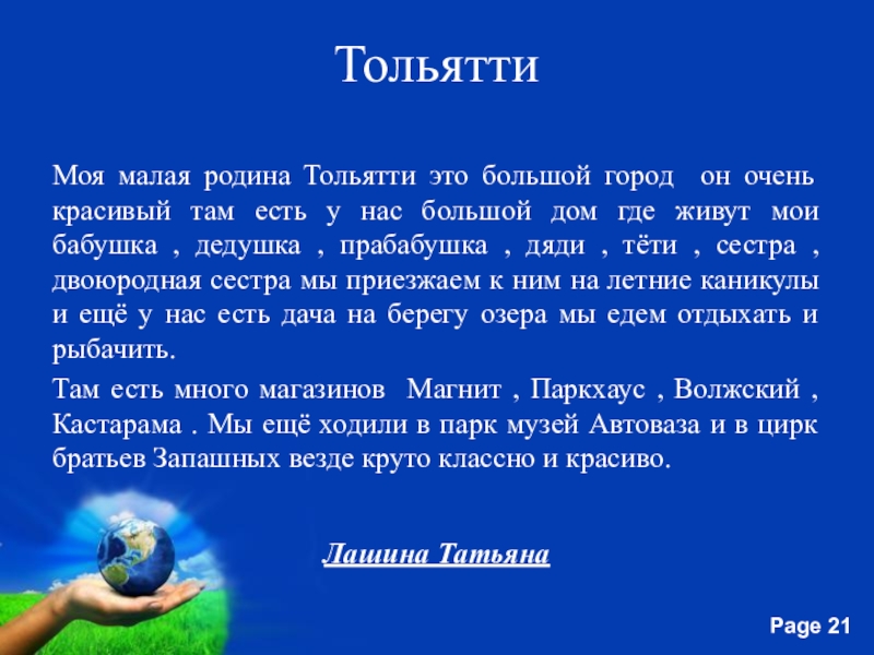 в Украине .Я люблю свою малую родину у меня там бабушка живёт с дедушкой и дядей. Мне там очень-очень нравится там мои друзья. Мы были в Украине и там тоже очень красиво там большие дома и чистый город короче там красиво. В Украине живут прабабушка и прадедушка.
