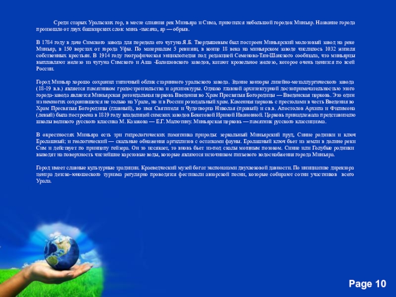 слияния рек Миньяра и Сима, приютился небольшой городок Миньяр. Название города произошло от двух башкирских слов: минь -тысяча, яр — обрыв.