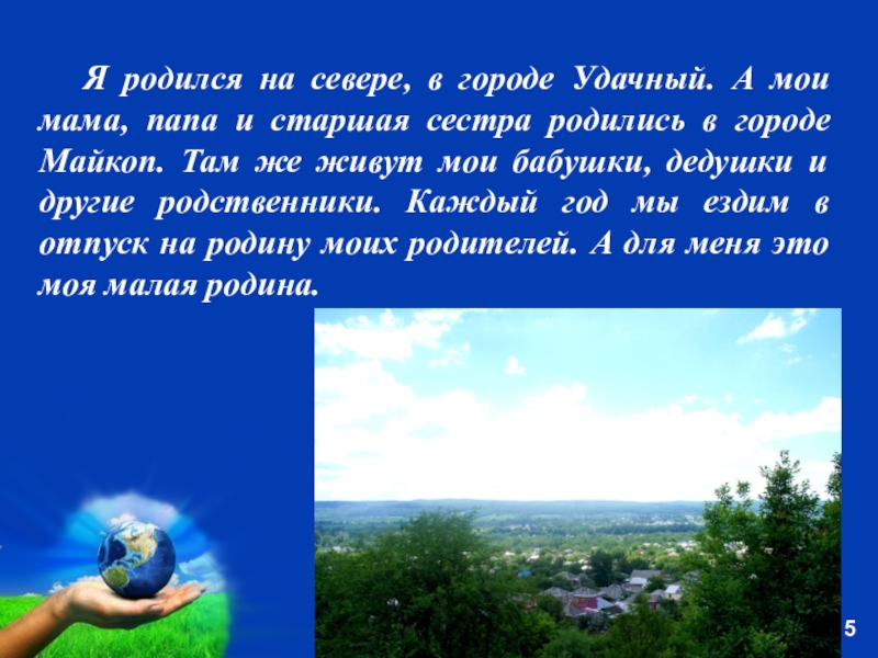 мама, папа и старшая сестра родились в городе Майкоп. Там же живут мои бабушки, дедушки и другие родственники. Каждый год мы ездим в отпуск на родину моих родителей. А для меня это моя малая родина.