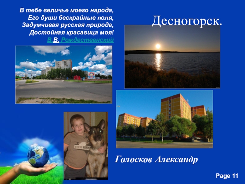 Десногорск-самый молодой город на Смоленщине. История его возникновения связана со строительством атомной электростанции на берегу реки Десна. Первые строители появились здесь в 1971г., а спустя три года безымянный посёлок получил своё официальное имя-Десногорск. Городом он стал в 1989г.. Сегодня это красивый современный город с населением 35 тыс. человек. В городе нет улиц, а многоэтажные дома нумеруются по микрорайонам. Многие дома раскрашены в различные пёстрые цвета. Поэтому в городе начинает подниматься настроение. Горожане приятные и вежливые люди. На улицах чисто. В центре города находится небольшой парк с фонтаном и православный собор иконы Божьей Матери *Всех скорбящих Радость*. В Десногорске прекрасное водохранилище полное самой разнообразной рыбы. Поскольку вода в водохранилище подогревается круглосуточно, оно никогда не замерзает. В 33 км от города находится Музей-усадьба композитора М.И.Глинки. На окраине города - *Курган Славы*, в память о боях Великой Отечественной войны.