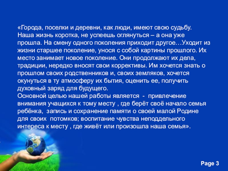 Основной целью нашей работы является - привлечение внимания учащихся к тому месту , где берёт своё начало семья ребёнка, запись и сохранение памяти о своей малой Родине для своих потомков; воспитание чувства неподдельного интереса к месту , где живёт или произошла наша семья».