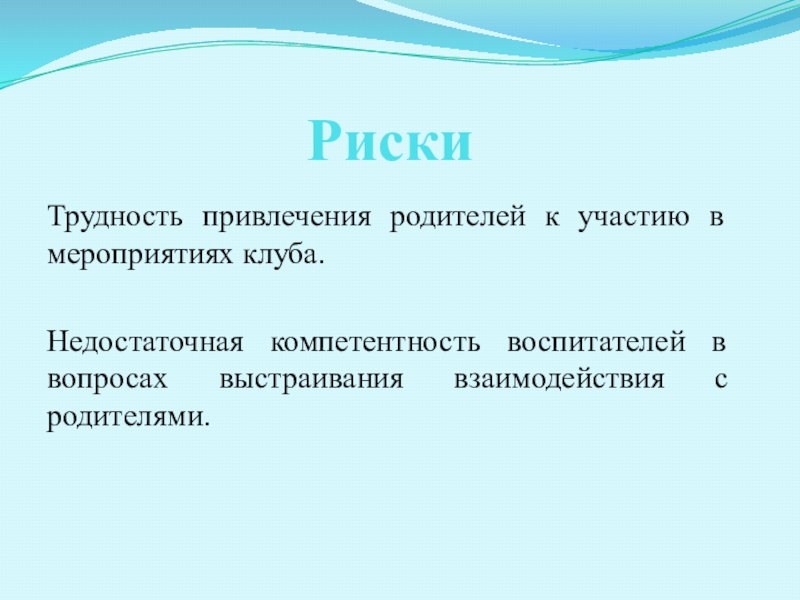 РискиТрудность привлечения родителей к участию в мероприятиях клуба.Недостаточная компетентность воспитателей в вопросах выстраивания взаимодействия с родителями.
