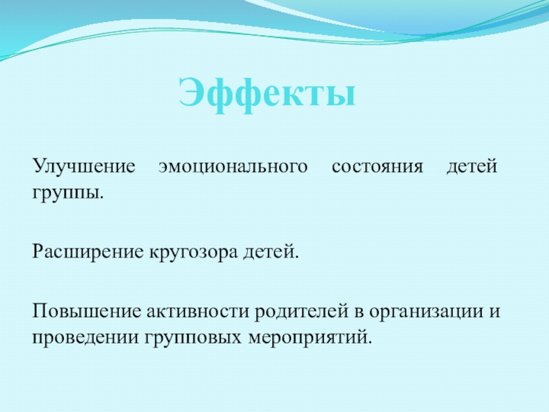ЭффектыУлучшение эмоционального состояния детей группы.Расширение кругозора детей.Повышение активности родителей в организации и проведении групповых мероприятий.