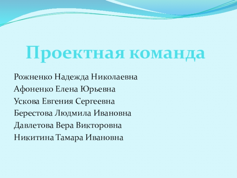 Проектная командаРожненко Надежда НиколаевнаАфоненко Елена ЮрьевнаУскова Евгения СергеевнаБерестова Людмила ИвановнаДавлетова Вера ВикторовнаНикитина Тамара Ивановна