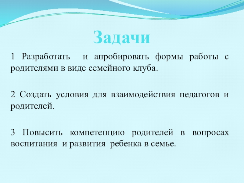 Задачи1 Разработать и апробировать формы работы с родителями в виде семейного клуба.2 Создать условия для взаимодействия педагогов
