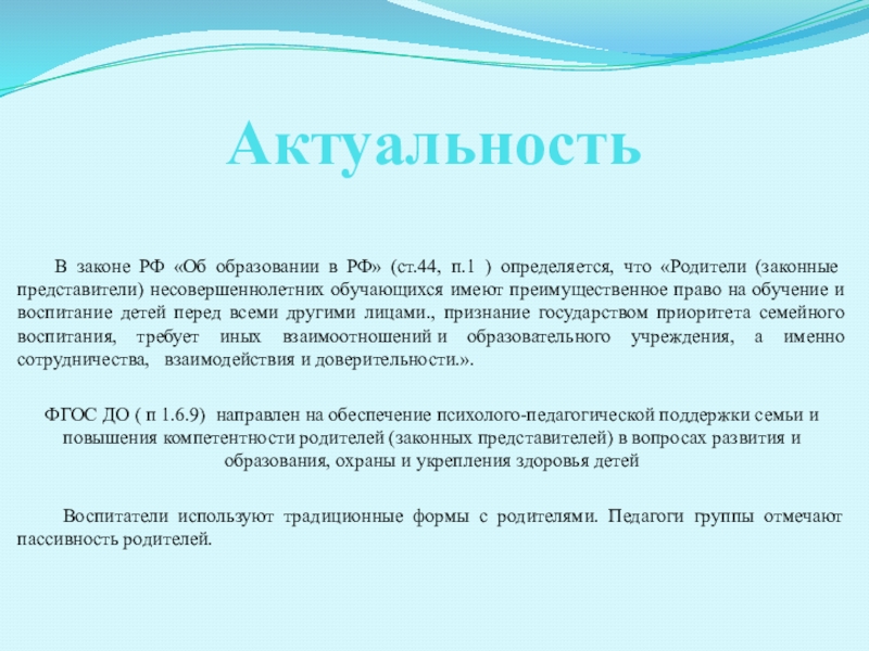 Актуальность   В законе РФ «Об образовании в РФ» (ст.44, п.1 ) определяется, что «Родители (законные
