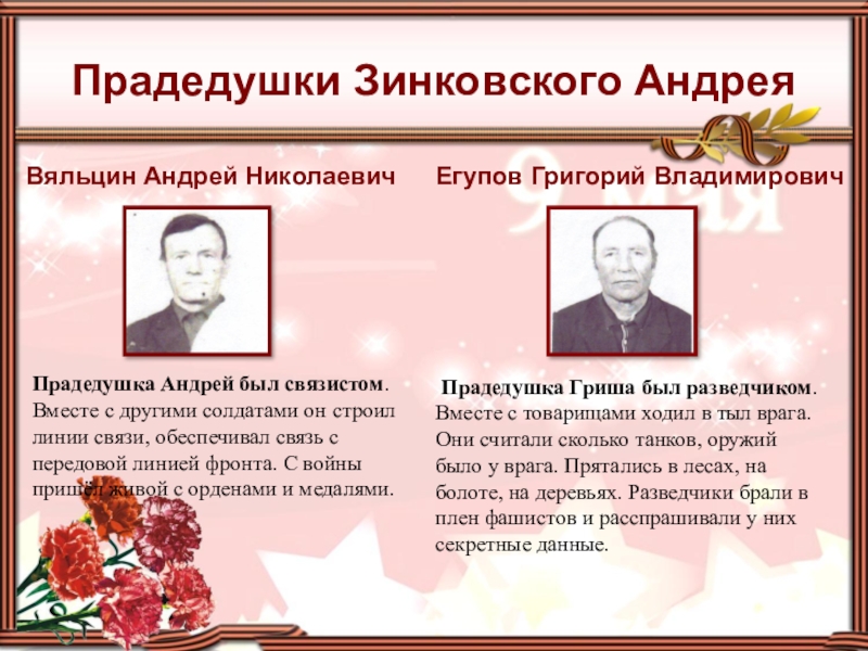 Прадедушка Гриша был разведчиком. Вместе с товарищами ходил в тыл врага. Они считали сколько танков, оружий было у врага. Прятались в лесах, на болоте, на деревьях. Разведчики брали в плен фашистов и расспрашивали у них секретные данные.