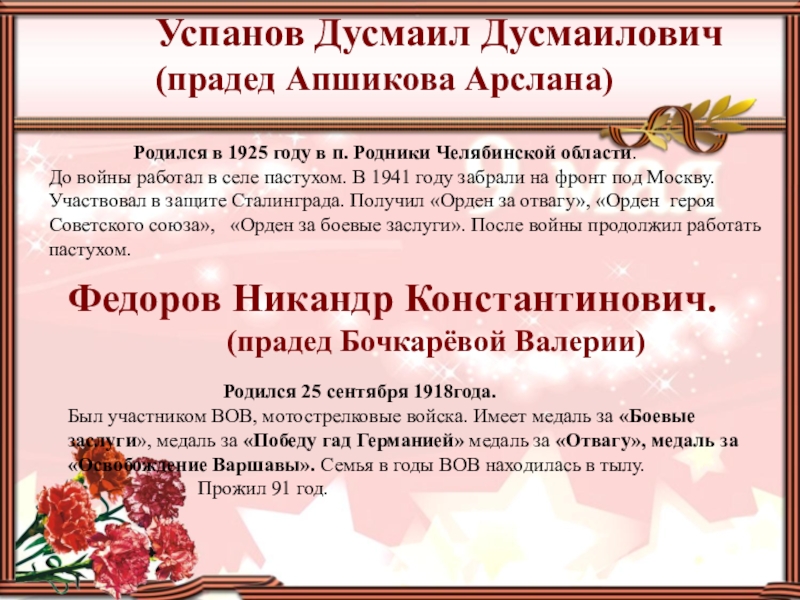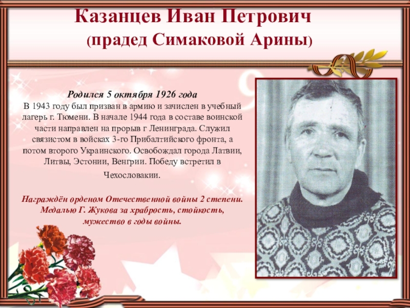 Родился 25 сентября 1918года. Был участником ВОВ, мотострелковые войска. Имеет медаль за «Боевые заслуги», медаль за «Победу гад Германией» медаль за «Отвагу», медаль за «Освобождение Варшавы». Семья в годы ВОВ находилась в тылу.